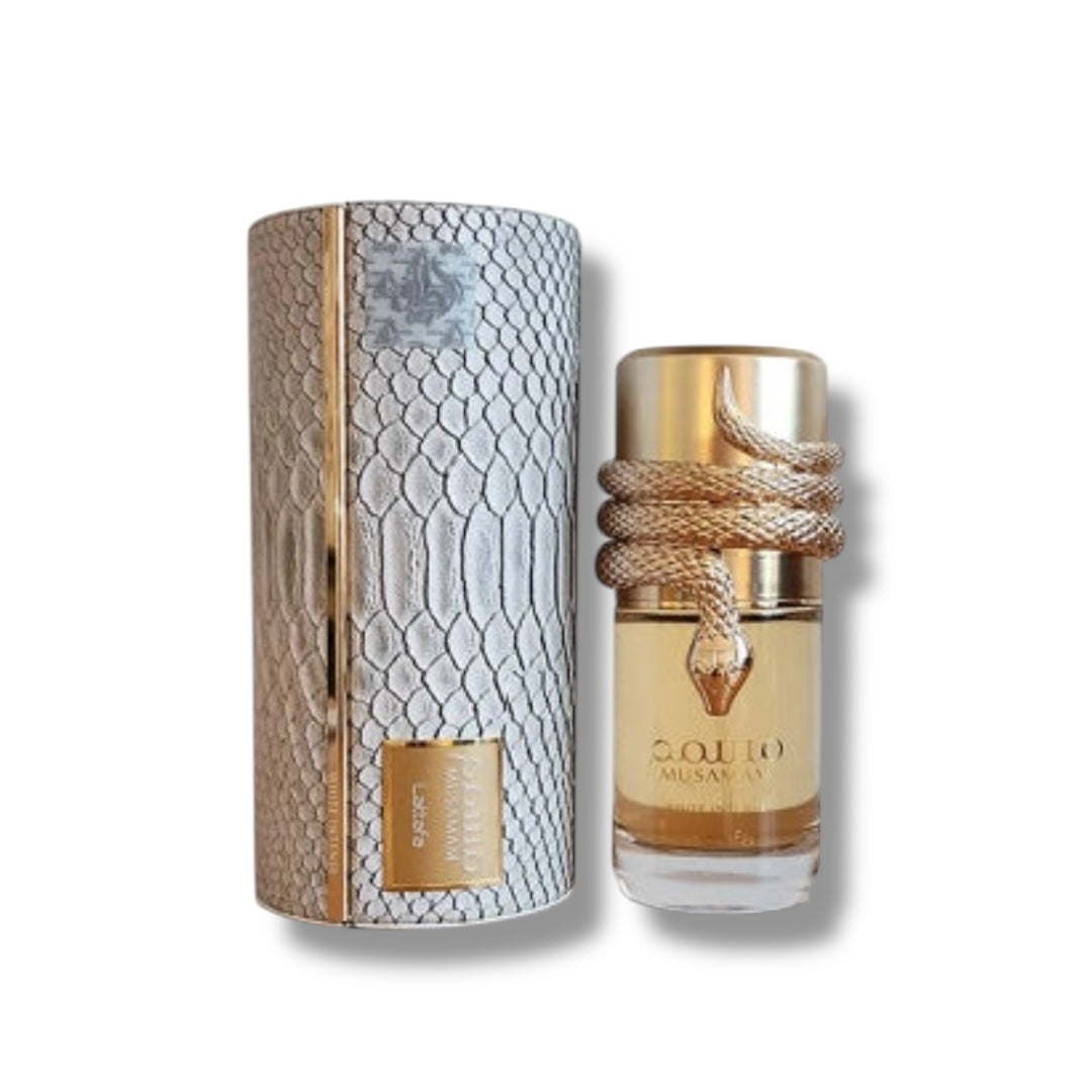 Musamam White Intense wraps creamy coconut and bright citrus in a warm, spicy glow over polished woods. A golden whisper of amber and vanilla adds depth, while soft musks and powdery florals smooth the edges—luxurious yet comfortable, with a sleek silver-white-gold aura inspired by its snake-embossed presentation.