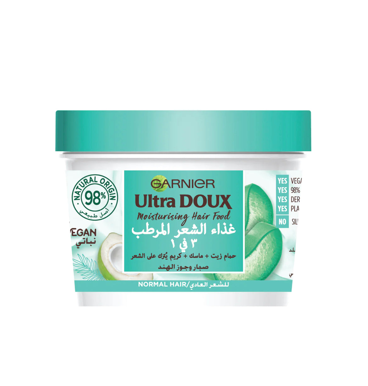 Garnier Ultra Doux Vegan Hair Food՝ սոված մազերը սնուցելու մեր նոր միջոցը: 98% բնական ծագումով և 100% վեգան խառնուրդներով, այն հարստացված է Super Food Extracts-ով սուպեր մազերի համար: Խոնավեցնող ալոե վերայի և կոկոսի այս վերջնական խառնուրդը սնուցող 3-ը 1-ում մազերի դիմակ է նորմալ մազերի համար: Ալոե Վերա մազերի սնունդը վայելելու 3 եղանակ; որպես տաք յուղով լոգանք, որպես դիմակ կամ որպես կրեմ: