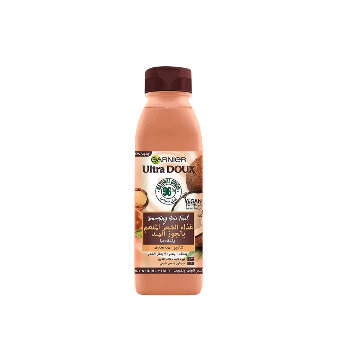 Garnier Ultra Doux Vegan Hair Food՝ սոված մազերը սնուցելու մեր նոր միջոցը: 96% բնական ծագումով և 100% վեգան խառնուրդներով, այն հարստացված է սուպերմազերի համար նախատեսված Super Food Extracts-ով: Smoothing Coconut & Macadamia-ի այս վերջնական խառնուրդը սնուցող շամպուն է չոր և փխրուն մազերի համար: