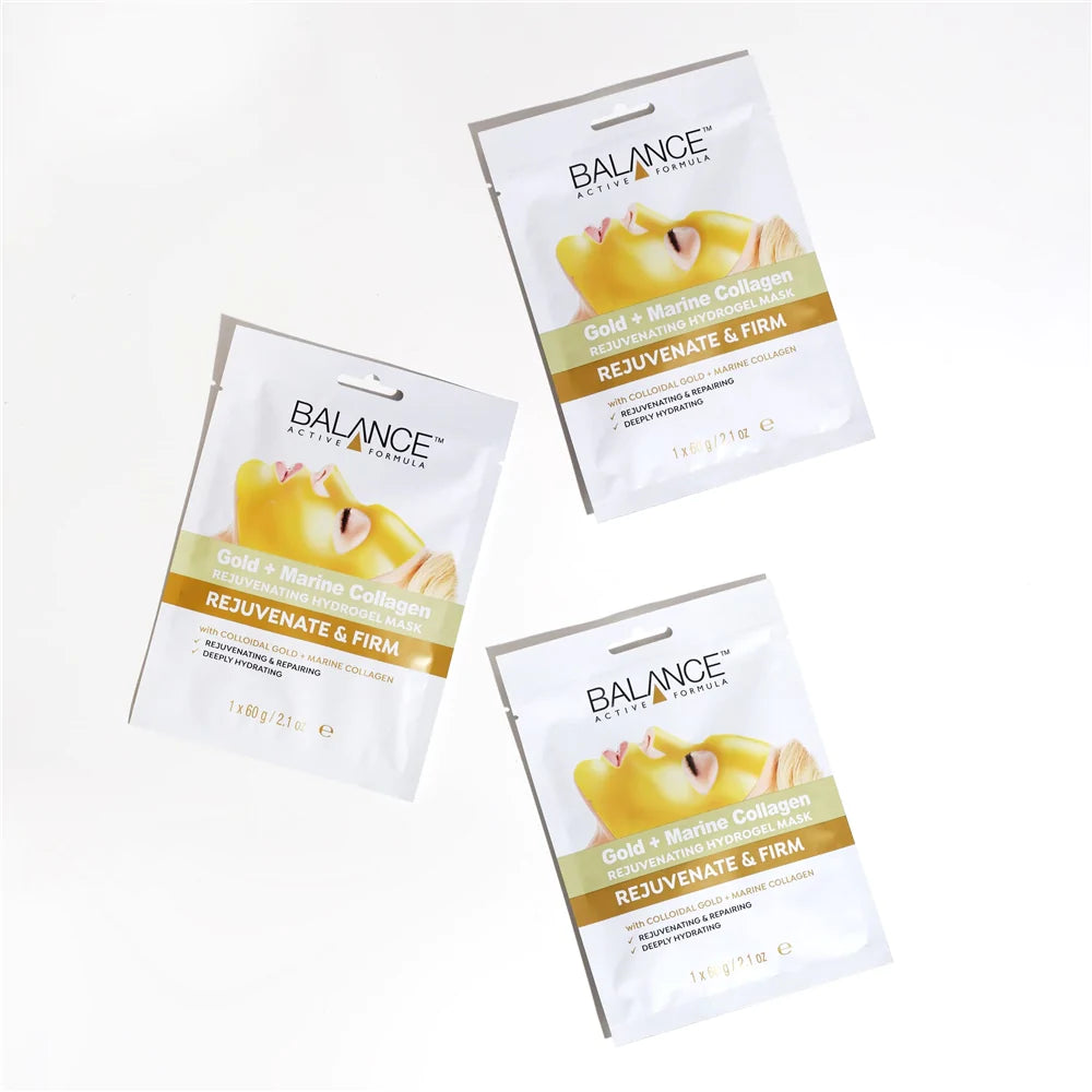 - Balance Active Formula Gold Collagen Rejuvenating Hydrogel Mask contains Colloidal Gold, to give a natural radiant glow, and Marine Collagen to help smooth and protect. It cools and soothes tired skin, deeply hydrates and softens for a healthy glow.
