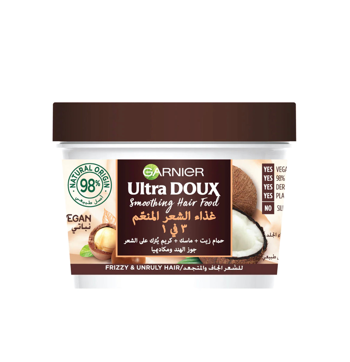 Garnier Ultra Doux Vegan Hair Food, our new way to nourish hungry hair. With 98% Natural Origin and 100% Vegan Blends, it is enriched with Super Food Extracts for Super Hair. This Ultimate blend of Smoothing Coconut & Macadamia is a nourishing 3-in-1 hair mask treatment for Frizzy and Unruly Hair. 3 ways to enjoy Coconut Hair Food; as a Hot Oil Bath, as a Mask or as a leave in Cream.
